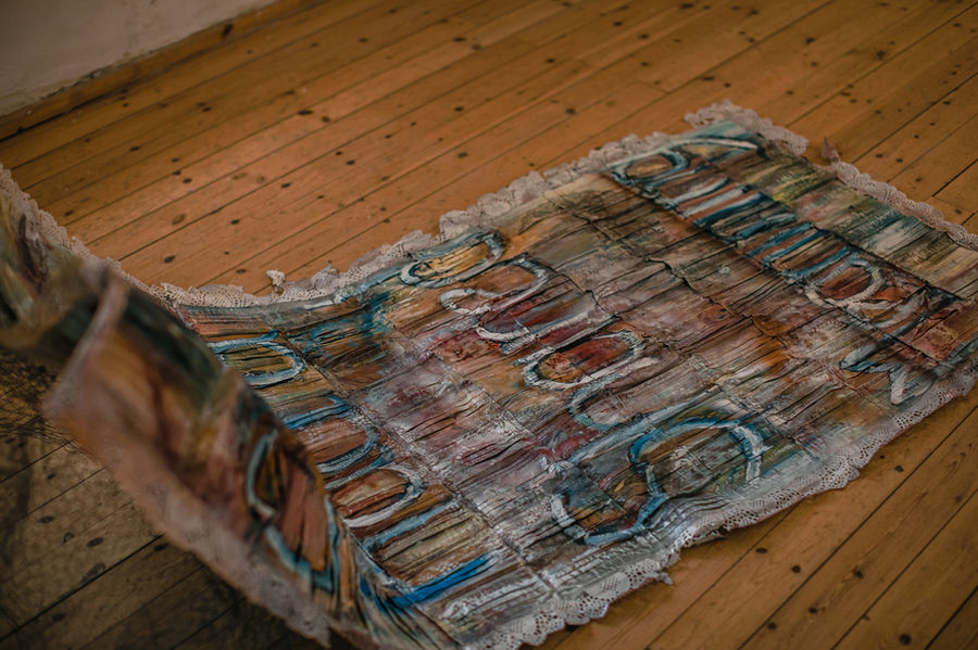 Face masks/coverings become textiles - a quilt, offering questions of identity and ephmerality; 80 hand stitched disposable surgical masks are still used to protect, but in a different way.